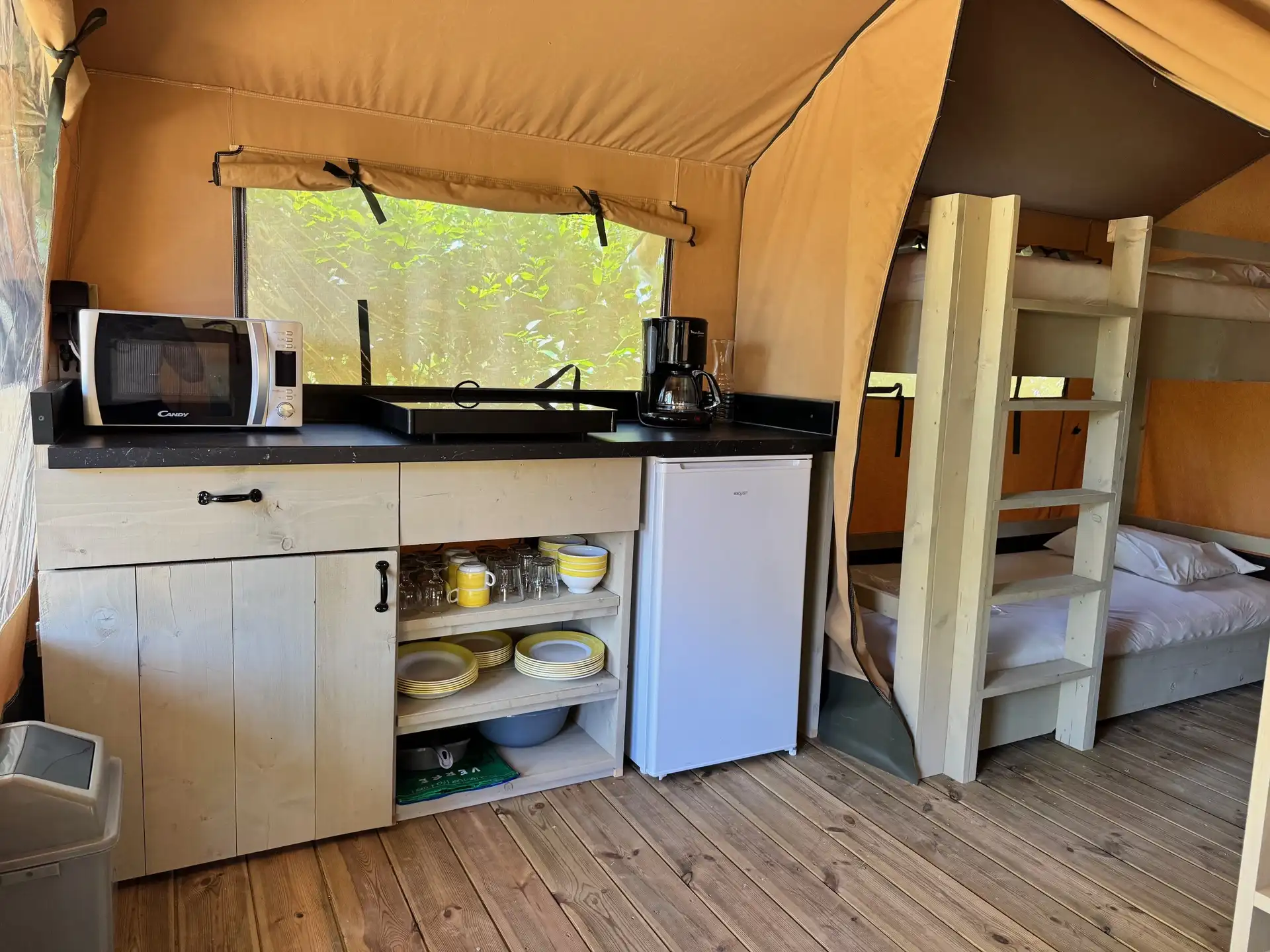 At Les Coudoulets campsite, we offer you a unique accommodation experience in Pradons: our tents are ideal for family holidays, romantic getaways or simply to get away from it all. Our tents are equipped with everything you need to relax and enjoy your stay: 4 Lodge Tents that can comfortably accommodate 3 to 4 people (including children and babies).